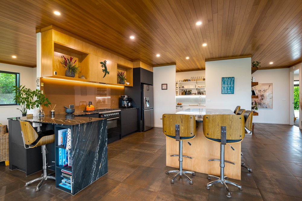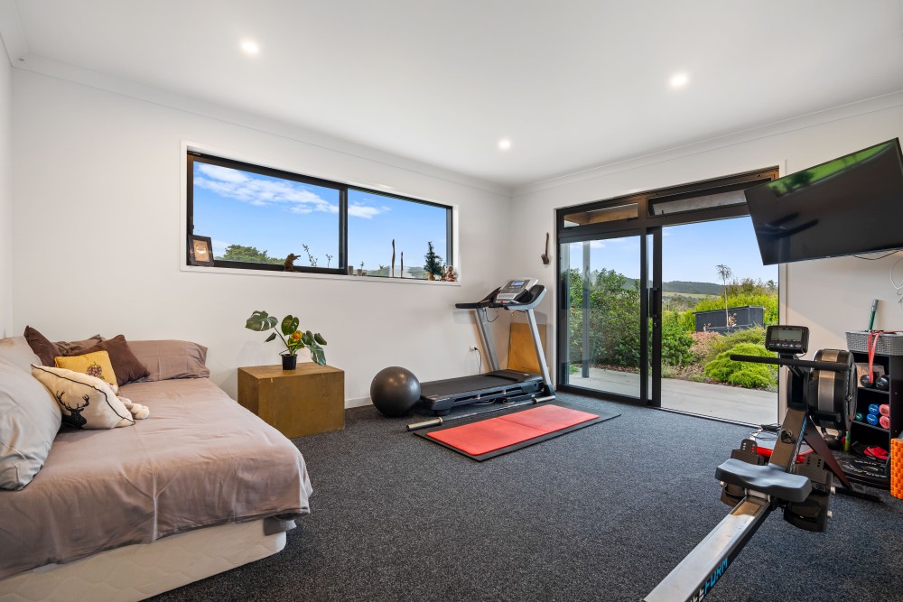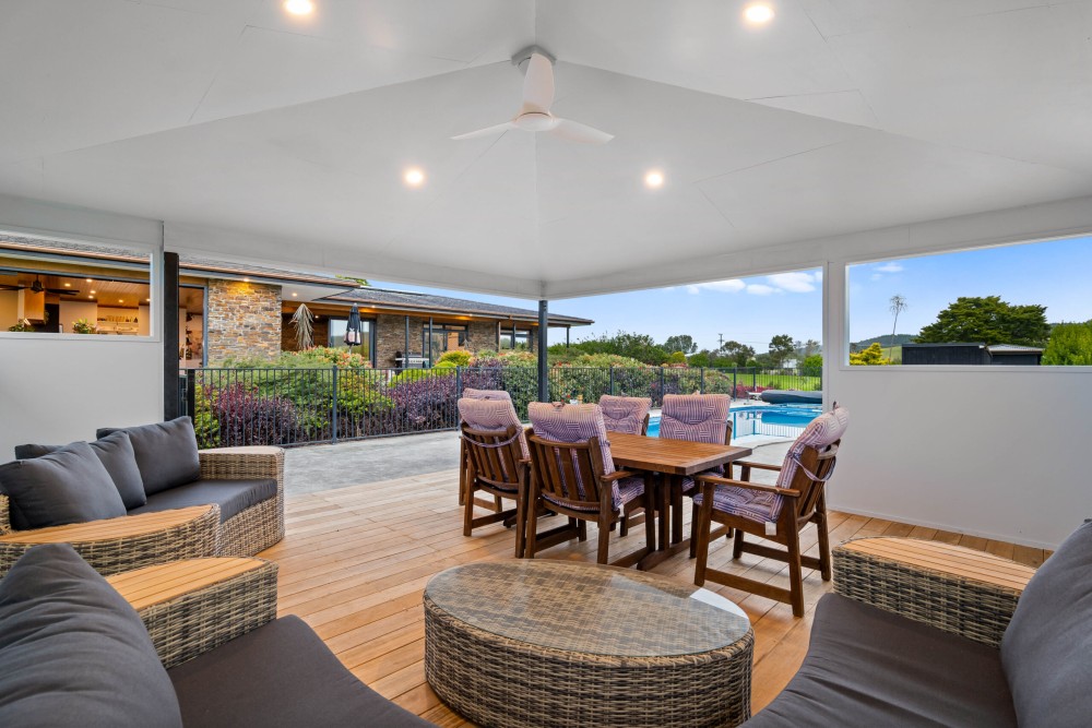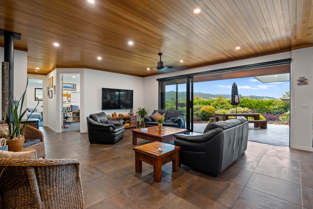 The 302 sqm main home features spacious living areas with Fijian Kauri timber ceilings, a freestanding wood fire with wet-back, and seamless indoor-outdoor flow. The entertainer’s kitchen boasts granite bench-tops, an ILVE 900mm oven, and a butler’s pantry. Four generous bedrooms include a master suite with a walk-in robe, ensuite, and spa access – perfect for unwinding. Outdoors, enjoy the 12m heated saltwater pool with a cabana, raised vegetable boxes, a thriving orchard, and a dedicated butchery/chiller room. A private bore ensures water supply to the gardens and orchard year-round.